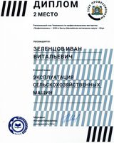 Зеленцов Иван – 2 место по компетенции «Эксплуатация сельскохозяйственных машин» под наставничеством Зуева Николая Андреевича