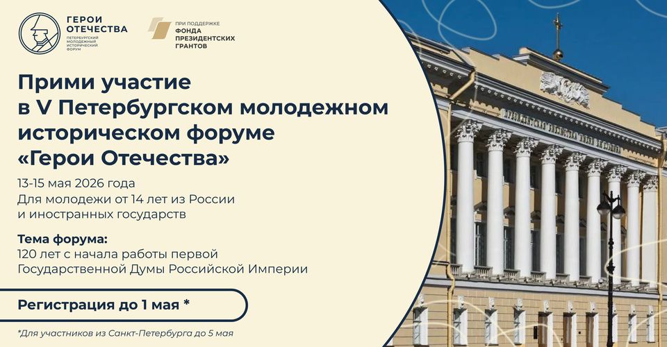 В период с 13 по 15 мая года в городе Санкт-Петербурге пройдёт V Петербургский молодёжный исторический форум «Герои Отечества» по инициативе команды школьников и студентов при поддержке Министерства просвещения Российской Федерации, Федерального агентства по делам молодёжи, Российского исторического общества, «Движение Первых», депутатов Государственной Думы и сенаторов Российской Федерации.