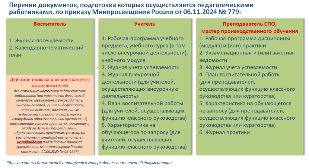 В связи со вступлением в силу 1 марта 2025 года приказа Министерства просвещения Российской Федерации от 6 ноября 2024 № 779 «Об утверждении перечня документов, подготовка которых осуществляется педагогическими работниками при реализации основных общеобразовательных программ, образовательных программ среднего профессионального образования» (зарегистрирован Министерством юстиции Российской Федерации 4 декабря 2024 г., регистрационный N 80454) определен исчерпывающий список документов для заполнения педагогическими работниками